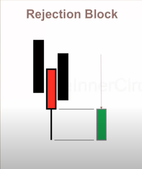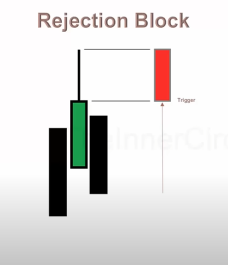 • What is it? A rejection block is one of ICT’s PDA concepts. It forms when a candle creates a long wick (or wicks) that sweeps liquidity before reversing.